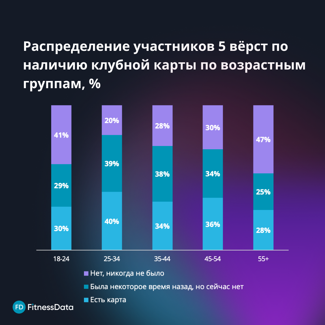 - Только 34% действующих участников сообщества 5 вёрст имеют клубные карты, 35% имели карты ранее, но сейчас не имеют карту, а 31% никогда не имели клубных карт. Фитнес когда-то потерял половину клиентов — это внушительная цифра, над возвращением этой аудитории можно работать.