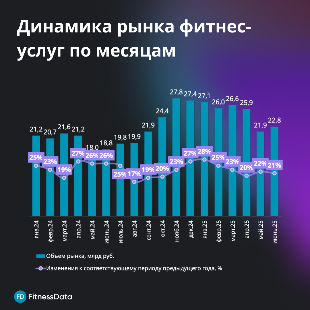 Темпы прироста рынка фитнес-услуг России без учета Москвы и Московской области составили лишь 16%, столичный регион суммарно обеспечил более 61% прироста рынка в абсолютном выражении в июне 2025 года. Очевидно, что ситуация продолжает усложняться, и рост фактора "сезонности" в качестве ключевой проблемы в опросах (https://t.me/fitnessdataru/816?single) операторов, похоже, связан вовсе не с сезонностью, а с сокращением потребительской активности.