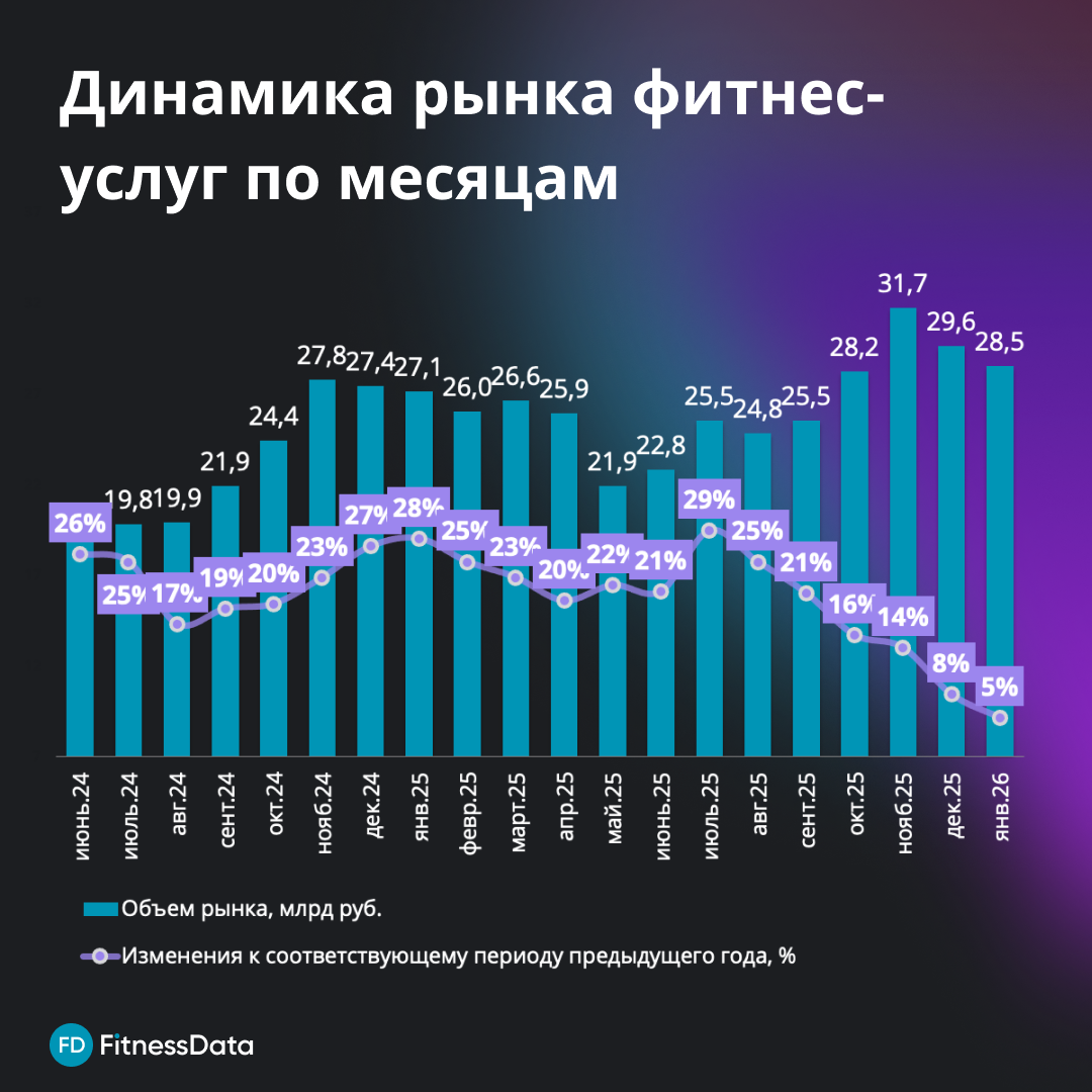 Оборот фитнес-отрасли в январе продолжил тренд, стартовавший в середине прошлого года — темпы прироста в отрасли продолжают снижаться: это заметно как по данным по потребительским расходам, которые раскрывают банки, так и по объему поискового трафика — в январе 2026 года объем поискового трафика в Яндексе был примерно на 20% ниже, чем в январе 2025 года.