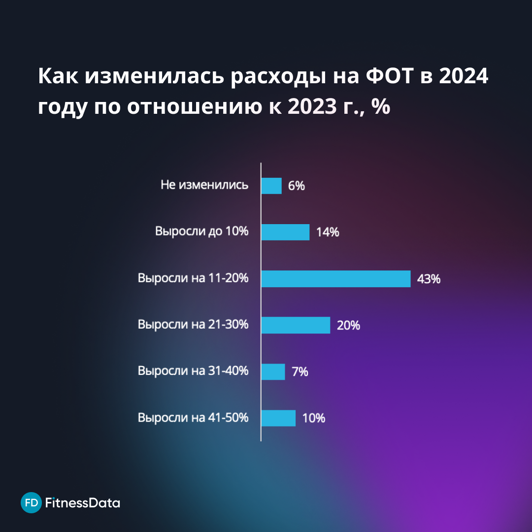 🔘 Лишь 20% опрошенных фитнес-операторов сумели удержать прирост расходов на ФОТ на уровне 10% и менее.