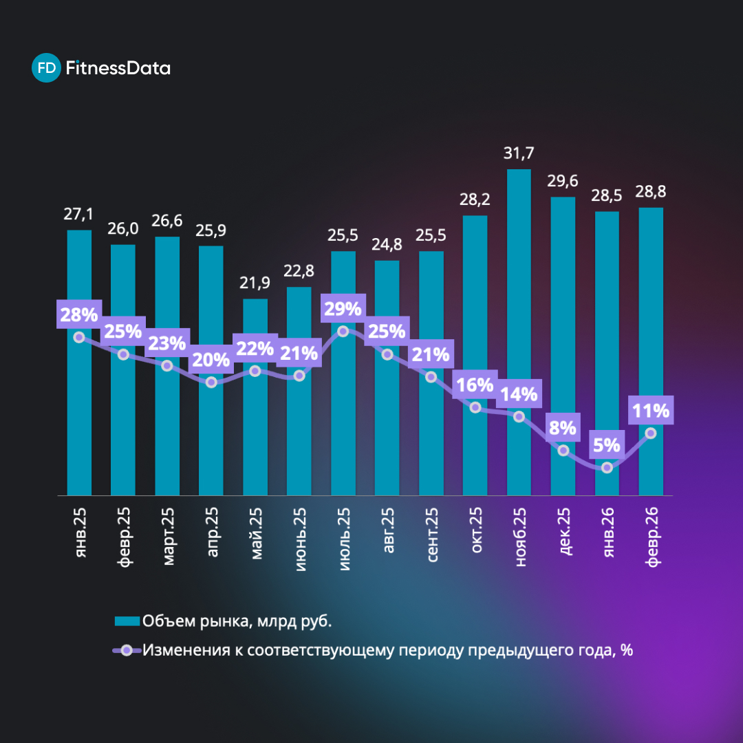 По итогам февраля 2026 года российский рынок фитнес-услуг показал прирост на 11% и вырос до 28,8 млрд руб. Основной прирост рынка по-прежнему обеспечивает инфляция на рынке: средний чек вырос на 6,5%. Однако стабилизация ситуации наступила далеко не во всех регионах, разбираемся с ключевыми показателями: